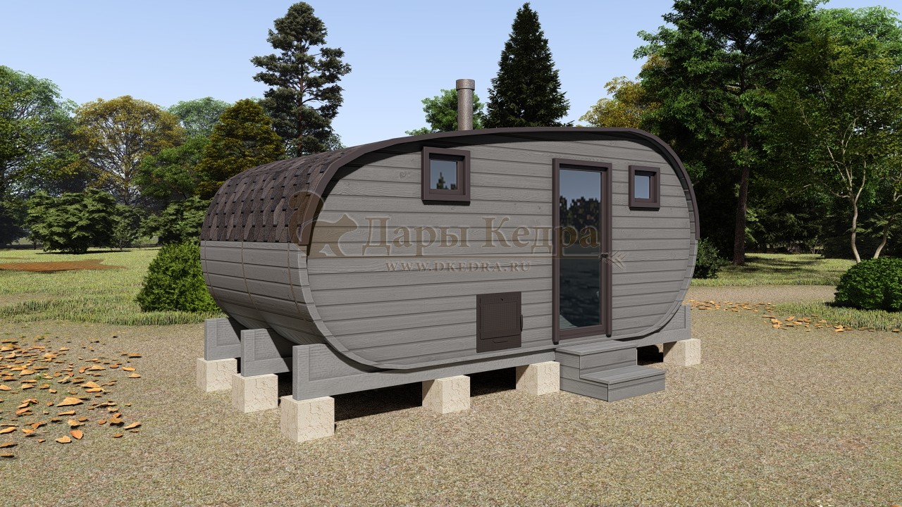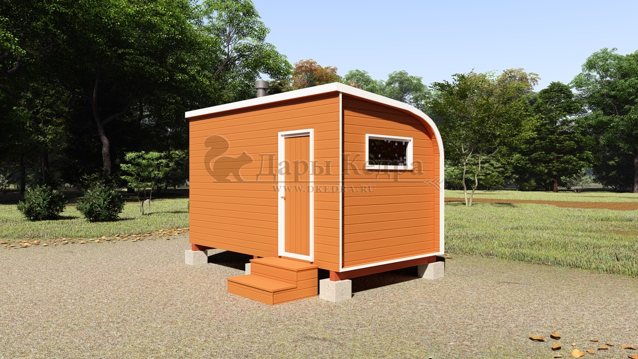 Симбиоз круглой и квадратной бани-бочки. Разработано с учётом эргономики, в ней так же просторно, как и в квадро-бочке, но при этом полукруглая крыша не дает задерживаться снегу и влаге на кровле. А еще такая баня безусловно красивая, мобильная и доступная каждому!