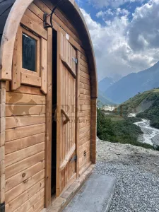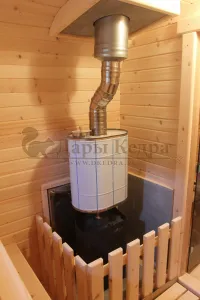 Это более просторная модель за счет увеличенной высоты потолков и ровного пола. В такой модели раздевалка совмещена с моечной. Тут установлен душевой поддон, вешалка, полочка и лавочка из кедра. В парильном отделении по обе стороны расположены двухуровневые открытые полки, печь находится между ними у дальней стены. Время растопки такой бани не превышает 30 минут. По вашему желанию баню-бочку можно укомплектовать козырьком, верандой и печью с внешней загрузкой, благодаря которой весь мусор во время топки остается на улице. Баня-бочка буханка не требует полноценный фундамент, поэтому при необходимости ее можно перенести в другое место.