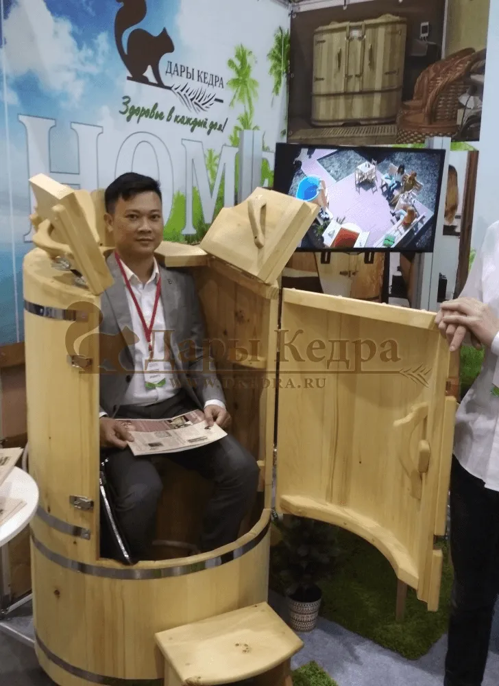 Готовый комплект - это полностью укомплектованный набор с полулежачей фитобочкой для процедур парения. Такая модель наиболее комфортна, так как позволяет принимать процедуры полулежа. Толщина стенок составляет 40-45 мм, что позволяет увеличить срок службы изделия. Фитобочка оборудована откидными створками, дверцей и отверстием для головы. Во время парения человек находится внутри кедровой бочки, а голова снаружи. Благодаря этому исключается возможность перегрева