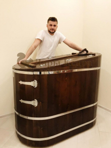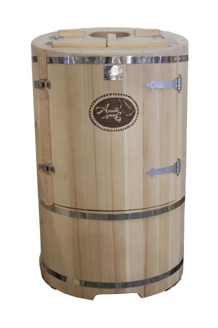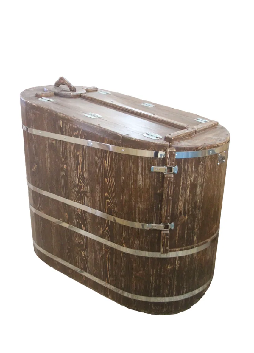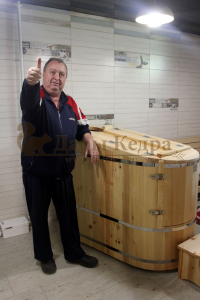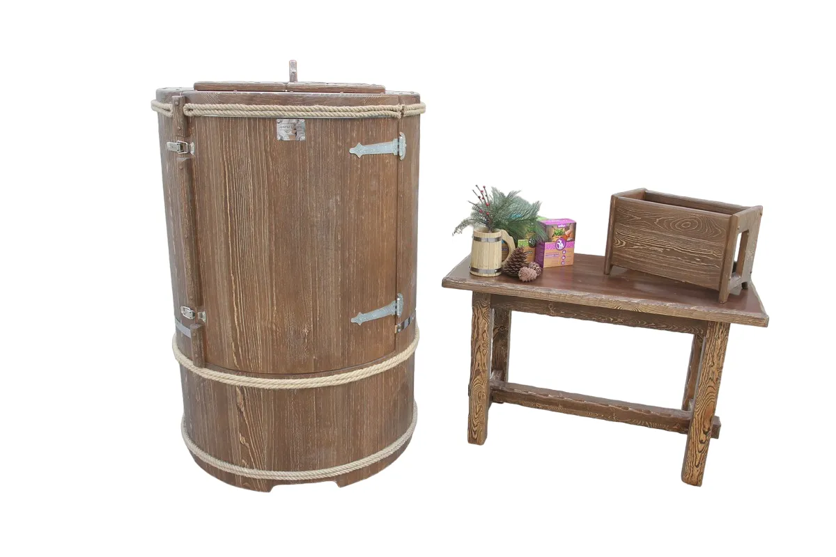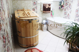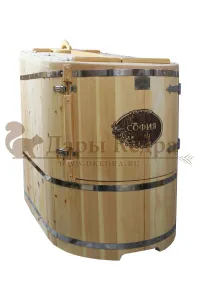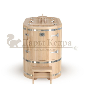 Готовый комплект - это полностью укомплектованный набор с полулежачей фитобочкой для процедур парения. Такая модель наиболее комфортна, так как позволяет принимать процедуры полулежа. Толщина стенок составляет 40-45 мм, что позволяет увеличить срок службы изделия. Фитобочка оборудована откидными створками, дверцей и отверстием для головы. Во время парения человек находится внутри кедровой бочки, а голова снаружи. Благодаря этому исключается возможность перегрева