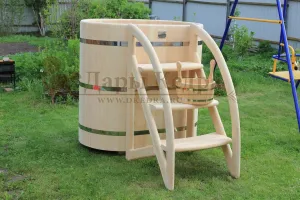 Это герметичная емкость для воды из кедра, которая используется для отдыха и охлаждения тела после процедур парения. Купель оснащена лавочками, приставной и внутренней лестницей из кедра. За счет стяжных болтов обручи из нержавеющей стали плотно прилегают к кедровой купели. Это позволяет равномерно распределять нагрузку воды и сохранить форму изделия в период эксплуатации. При правильном уходе купель для бани не рассыхается и не подвергается гниению. Овальная купель подходит для уличного и комнатного использования.